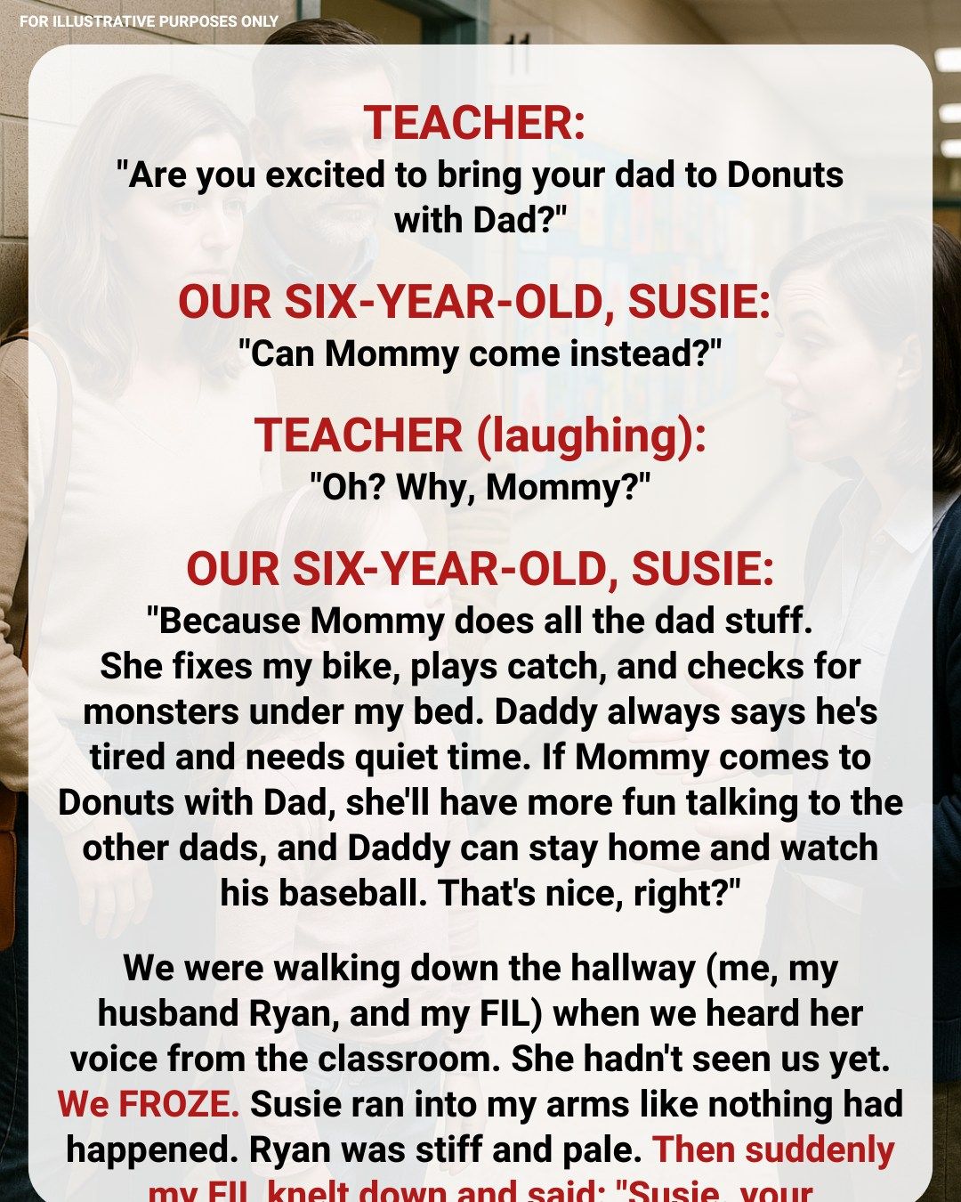“Are you excited to bring your dad to donuts, sweetheart?” Mrs. Powell asked cheerfully.