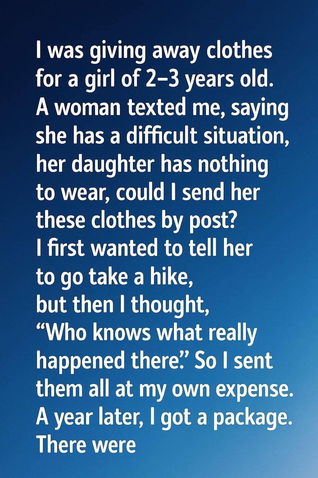 So I didn’t question it. I packed the clothes neatly, tucked in a little note wishing her and her daughter warmth, and paid for postage myself. I didn’t expect anything back. Honestly, I didn’t expect to hear from her again at all.