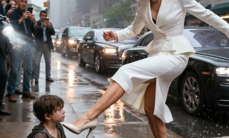 People turned. Phones rose. The billionaire known for her polished elegance was now berating a homeless child in the street. Her anger flared — she shoved him back. The boy stumbled, landing in a puddle.