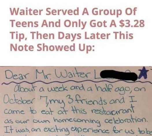 Waiter Upset Over Small Tip, Days Later, a Letter Changes Everything